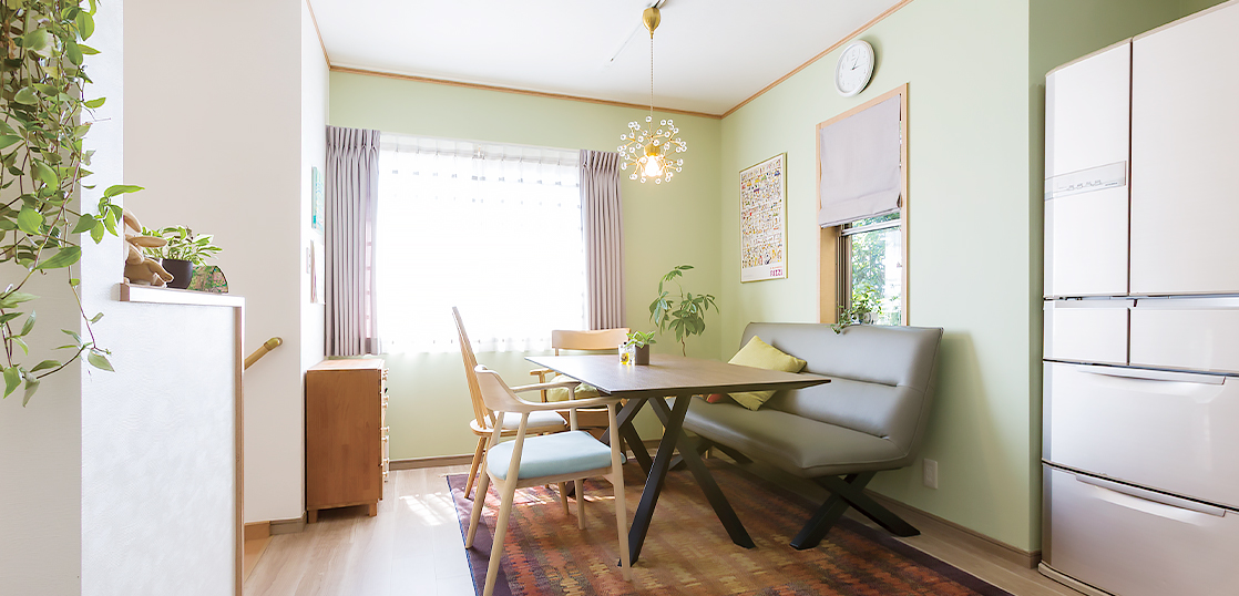 今回のリフォームのきっかけは、お子様の独立により、ご夫婦2人の生活となったことでした。普段の生活では広いスペースは必要ありませんが、友人や家族が気軽に集える “居心地のよさ”を大切にしたい。その為の“少し大きいテーブルと出入りしやすい椅子”の配置が可能な空間が必要でした。さらに、ご主人がリモートワークで特定の席を長時間利用するため、奥様も快適に過ごせるスペース確保も求められていました。