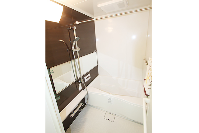 正面のアクセントパネルと幅の広い一枚鏡が高級感を演出しています。